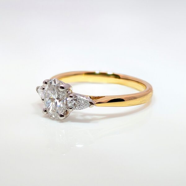 Shop our collection of stunning Lab Created Jewellery in Norwich. Discover our Oval Cut Lab Diamond Trilogy Ring, featuring a 0.75ct brilliant D/VS1 centre lab-grown diamond and a 0.21ct shoulder stones, set in luxurious 18ct yellow gold band. Celebrating the ‘past, present, and future’ symbolism, this piece makes an exceptional engagement ring or something to celebrate a special occasion. Find out more about lab grown diamonds here.