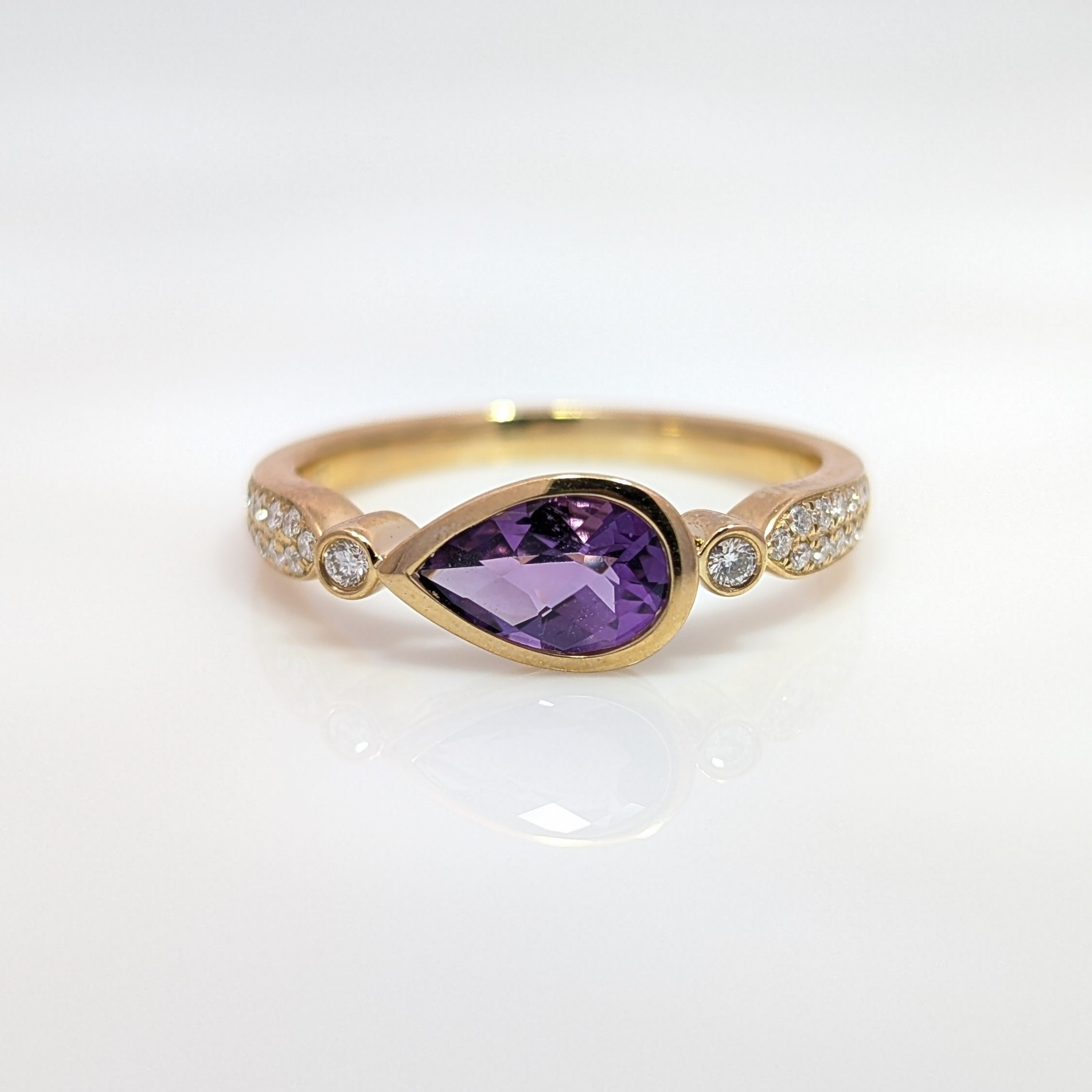 Pear Shaped Amethyst & Diamond Bezel Set Ring 9k Yellow Gold | 423250