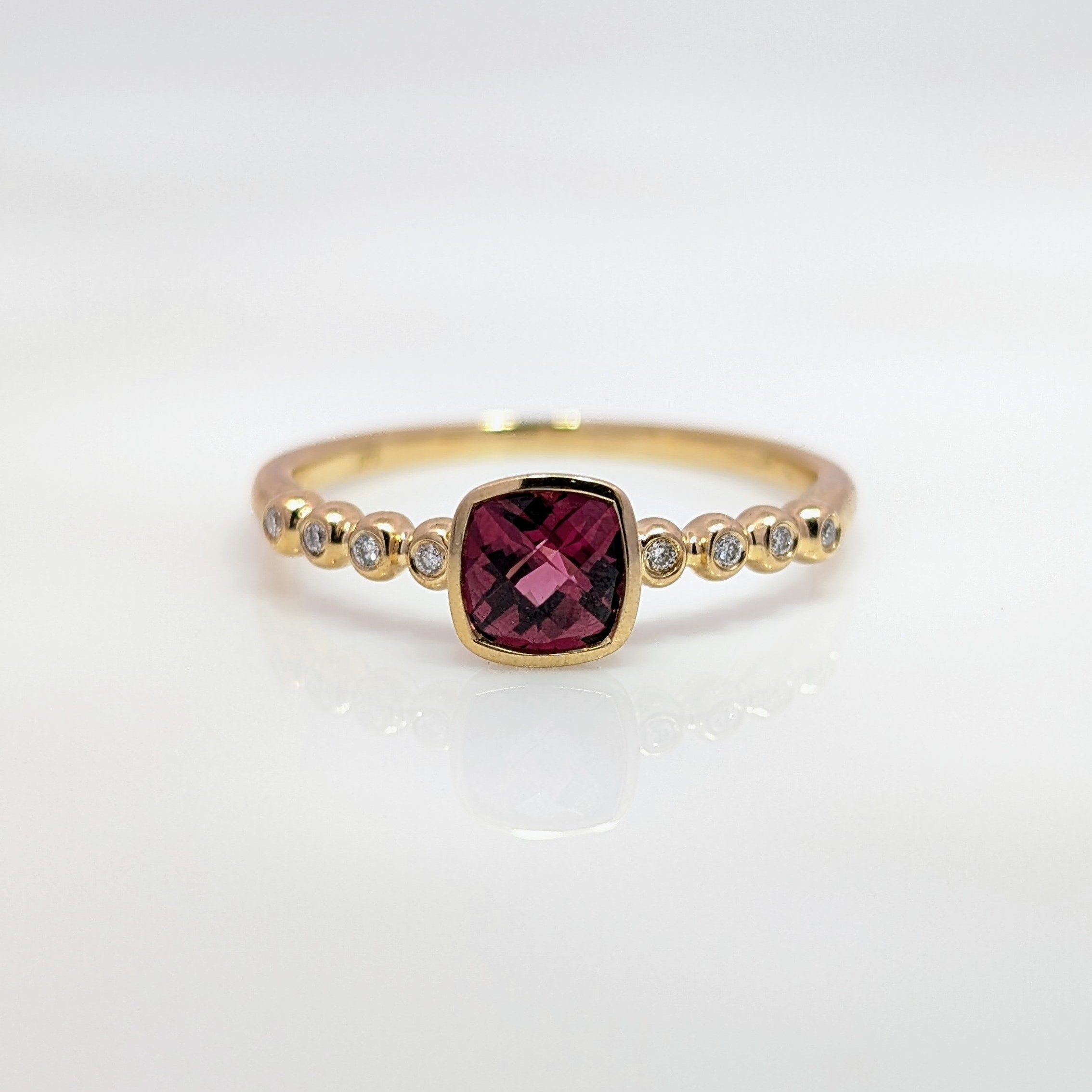 Cushion Shaped Rhodalite & Diamond Bezel Set Ring 9k Yellow Gold | 43247